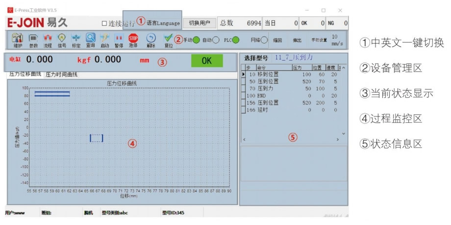 软件基于 windows 平台,实现压装工艺流程编制,压力位移曲线、压力时间曲线实时显示,一个工件多个压装步骤、多条压装曲线同时显示。支持判断窗口、包络线、测量等评估功能,输出 OKING 结果,用户等级化管理可以设置不同权限,压装历史记录、操作日志、报警日志方便查询。E-Press 工业软件支持 MS SQL、ACCeSS 等主流数据库格式。
